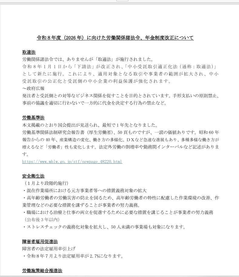 「働いて働いて、、、」40年ぶりとなる労働基準法改正* の通常国会はなりませんでしたが、令和8年も労働関係諸法令の改定が続きます。 *「労働基準関係法制研究会報告書」 https://www.mhlw.go.jp/stf/newpage_48220.html